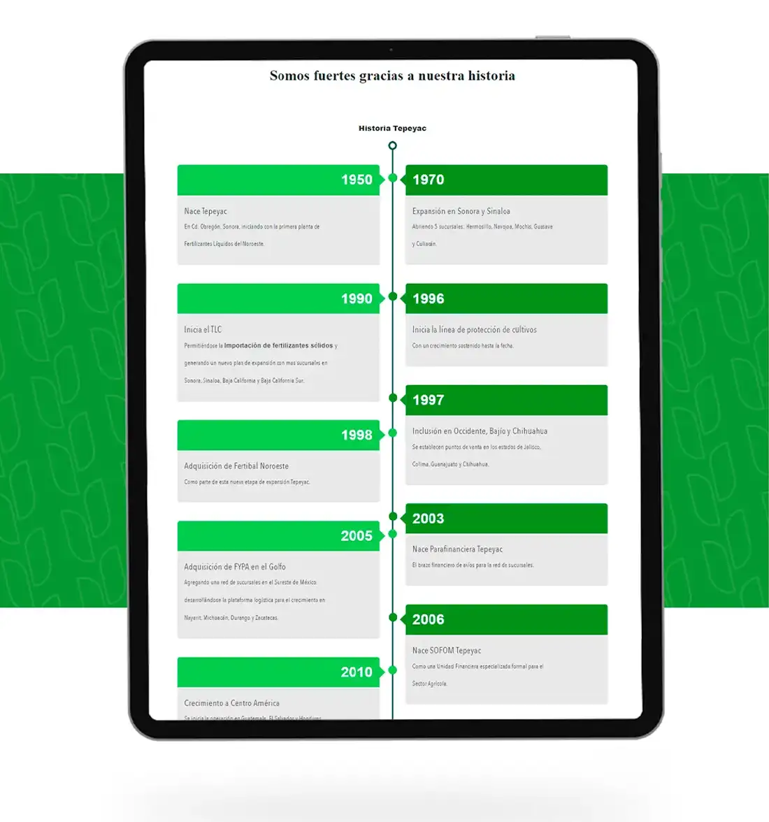 In 2020, we partnered with Fertilizantes Tepeyac to revamp their corporate website, aligning it with both visitor expectations and the company’s strategic objectives. Collaborating closely with their technology, marketing, and design teams, we aimed to craft a website that authentically portrays their identity and underscores their capacity to enhance agricultural yields.
